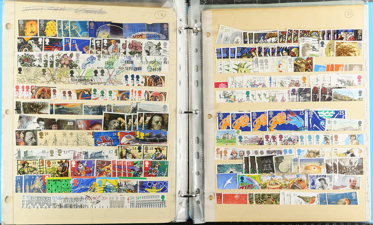 Carton full of thousands of worldwide stamps in a variety of formats. We note several album or stock pages in binders (one containing used Great Britain, the other New Zealand), albums, glassines, 102 cards, and loose stamps. A spot check indicated roughly 50 used Canada souvenir sheets (including a few modern ones), some mint British Commonwealth, and much more, including some items cataloguing $5 to $10 each. A nice winter project. Estimate =