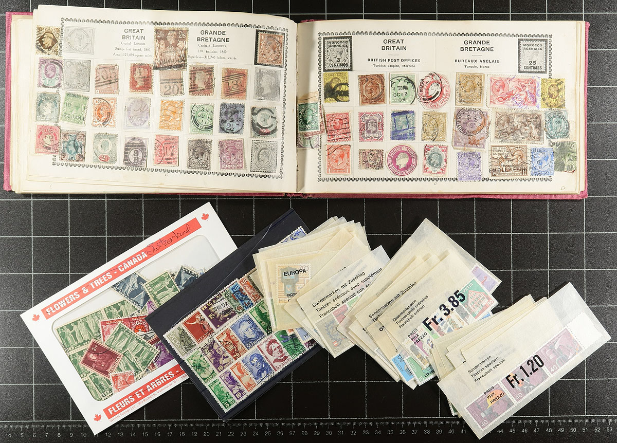 Eclectic box full of useful worldwide material, as received, and contains many hundreds of stamps in a variety of formats, including old-time approval parchment pages from Asia, album pages, 102 cards, loose stamps on and off paper, and more. We note better representation from China, Hong Kong (Victoria era up to the 1960's on several album pages, including used 1935 Silver Wedding set), Japan, and more, along with modern used Canada, used Switzerland and United States, etc. A very cursory check of material indicated items cataloguing $5 to $10 each, leaving potential finds to the dedicated collector. Should be a fun lot for worldwide collectors. Estimate =