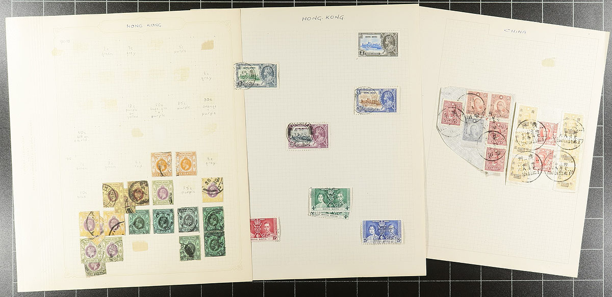 Eclectic box full of useful worldwide material, as received, and contains many hundreds of stamps in a variety of formats, including old-time approval parchment pages from Asia, album pages, 102 cards, loose stamps on and off paper, and more. We note better representation from China, Hong Kong (Victoria era up to the 1960's on several album pages, including used 1935 Silver Wedding set), Japan, and more, along with modern used Canada, used Switzerland and United States, etc. A very cursory check of material indicated items cataloguing $5 to $10 each, leaving potential finds to the dedicated collector. Should be a fun lot for worldwide collectors. Estimate =