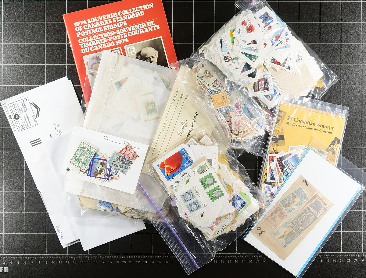 Eclectic box full of useful worldwide material, as received, and contains many hundreds of stamps in a variety of formats, including old-time approval parchment pages from Asia, album pages, 102 cards, loose stamps on and off paper, and more. We note better representation from China, Hong Kong (Victoria era up to the 1960's on several album pages, including used 1935 Silver Wedding set), Japan, and more, along with modern used Canada, used Switzerland and United States, etc. A very cursory check of material indicated items cataloguing $5 to $10 each, leaving potential finds to the dedicated collector. Should be a fun lot for worldwide collectors. Estimate =