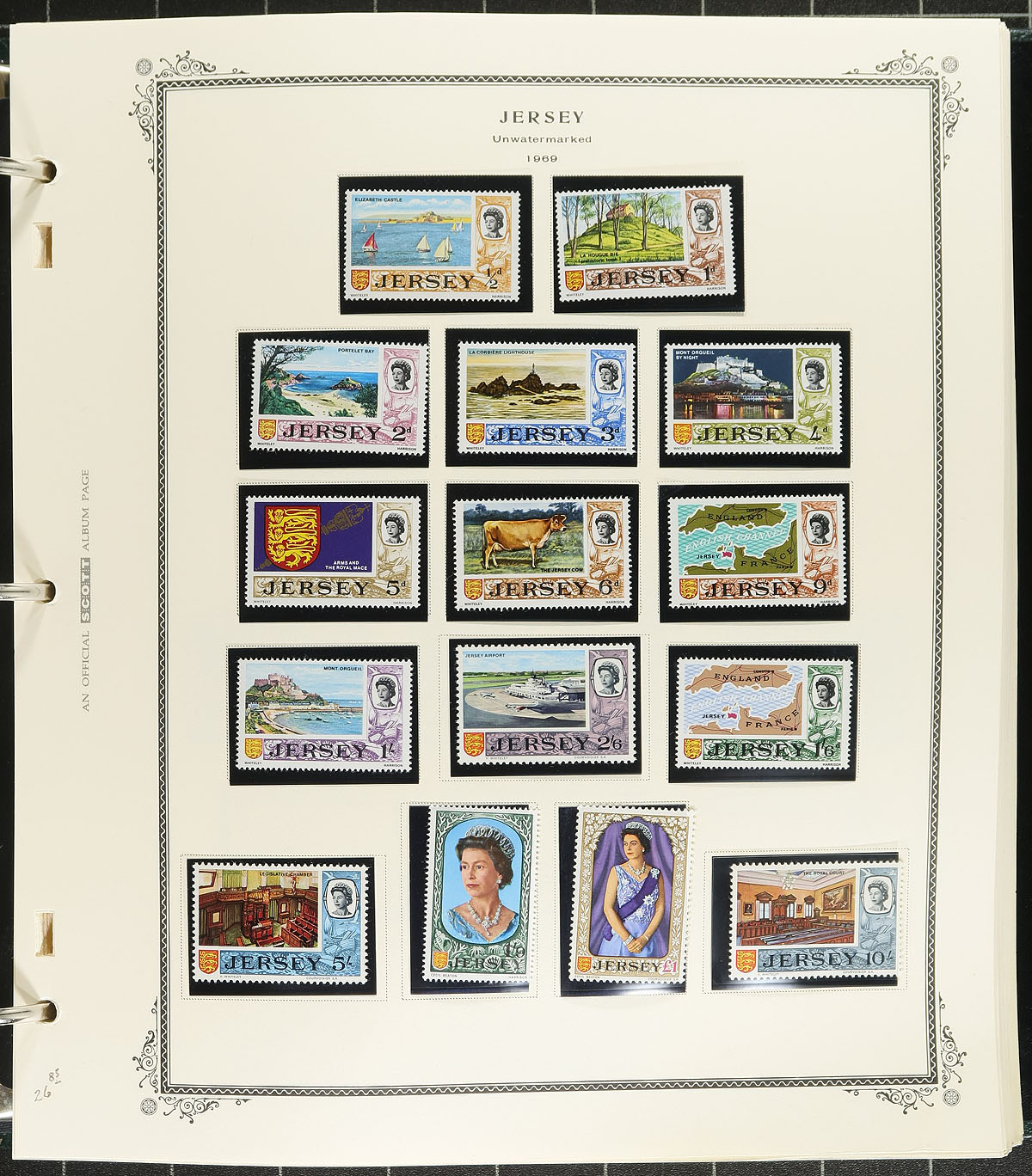 Lovely comprehensive collection of never hinged Jersey in a Scott Specialty album with slipcase, 1941-2005. This lovely collection ranges from Scott #N1/1161, including several souvenir sheets, booklets, and postage due issues. A spot check indicated many sets, booklets, and souvenir sheets, cataloguing $5 to $15 each. A lovely collection and in a classy album with hingeless album pages, and should be continued until completion. Very fine. 2026 Scott US$1,614.00 =
