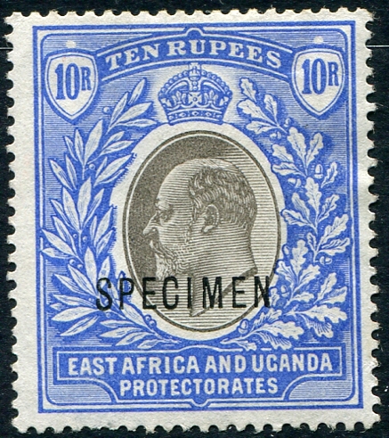 Fine mint part original-gum Hinged example of the 10r ultra & black, Edward VII high-value, (watermark 2, Crown/CA), with horizontal "SPECIMEN" overprint in black. While Gibbons / Scott are continuously listing more of the "specimen" overprints, this one is yet to be listed in either catalogue. The regular stamps lists in Scott at US$475.00 ($641.25 CDN) and in Gibbons (#14) at £450.00 ($841.00 CDN). Estimate =