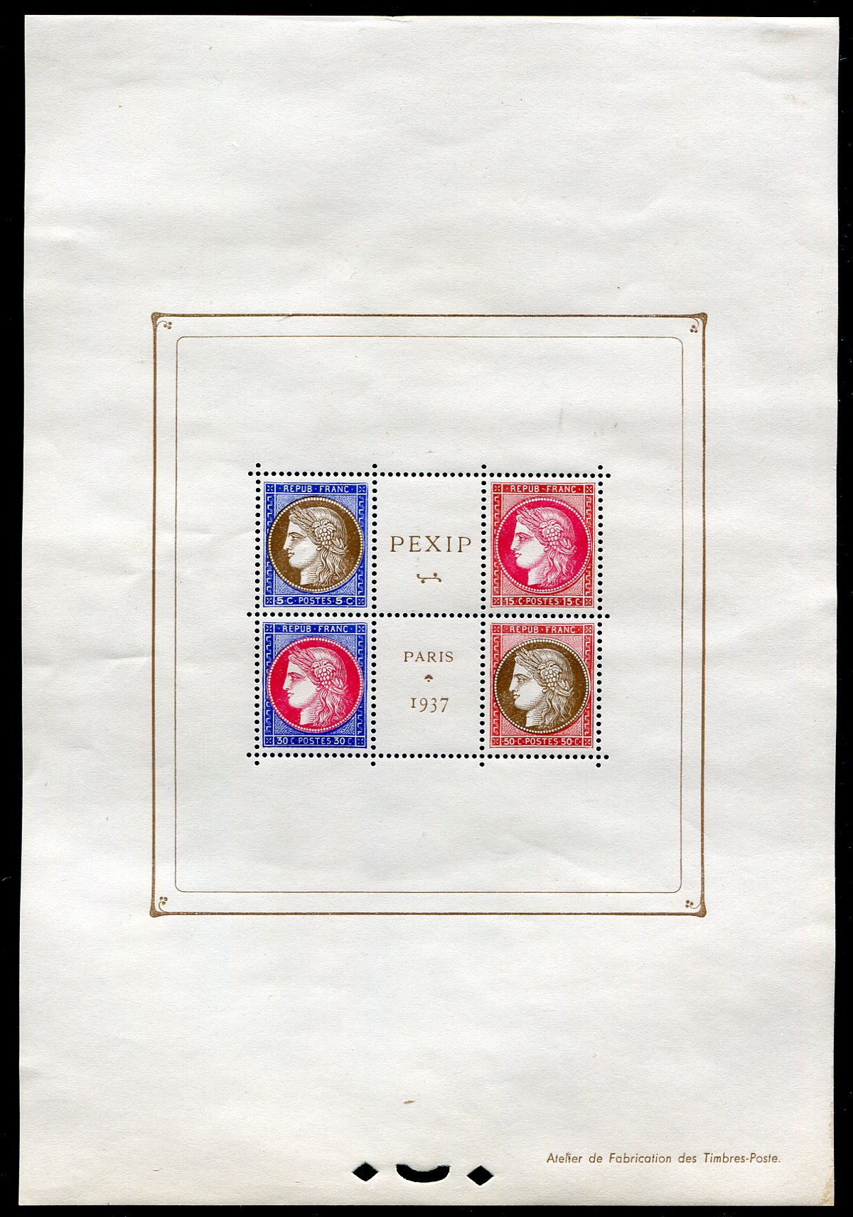 The 1937 International Philatelic Exhibition (PEXIP Exhibition) souvenir sheet, mint lightly-hinged in the selvedge, with never hinged stamps. These Exposition used sheets, which were only sold at the exhibition in Paris, a ticket of admission required for each sheet purchased. Usual minor wrinkles, as usually seen on these sheets, mentioned "for the record". 2026 Scott US$360.00 =