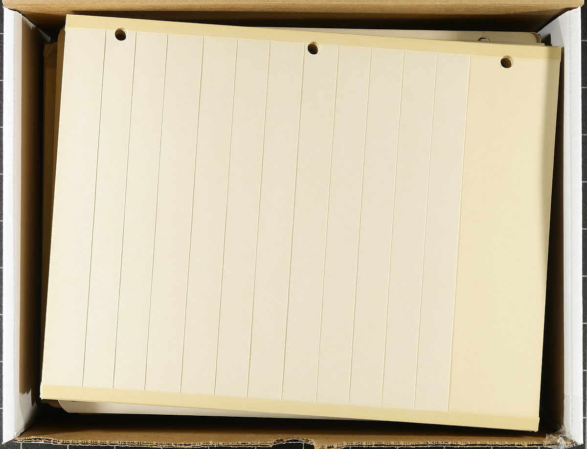 Manila Stocksheets. A small box containing 100 lightly / moderately used stocksheets. The standard 3-ring hole punch pages are ready to be given a binder and live another day. The "new" retail cost on these is over $150.00. A very cost-effective way to store your duplicates without having to pay retail for them. Estimate =