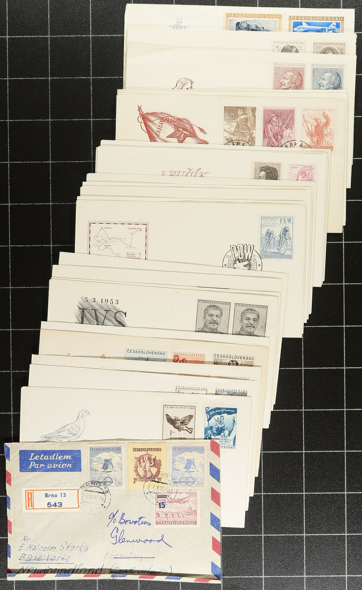 Group of roughly 275 Czechoslovakia first day covers, 1953-1970, neatly organized by year in a small box. We note mostly sets frankings, noting many thematic and topical frankings including butterflies, sports (including Olympics), transportation, animals, and more, including some nice cachets. A clean group for all collectors. Estimate =