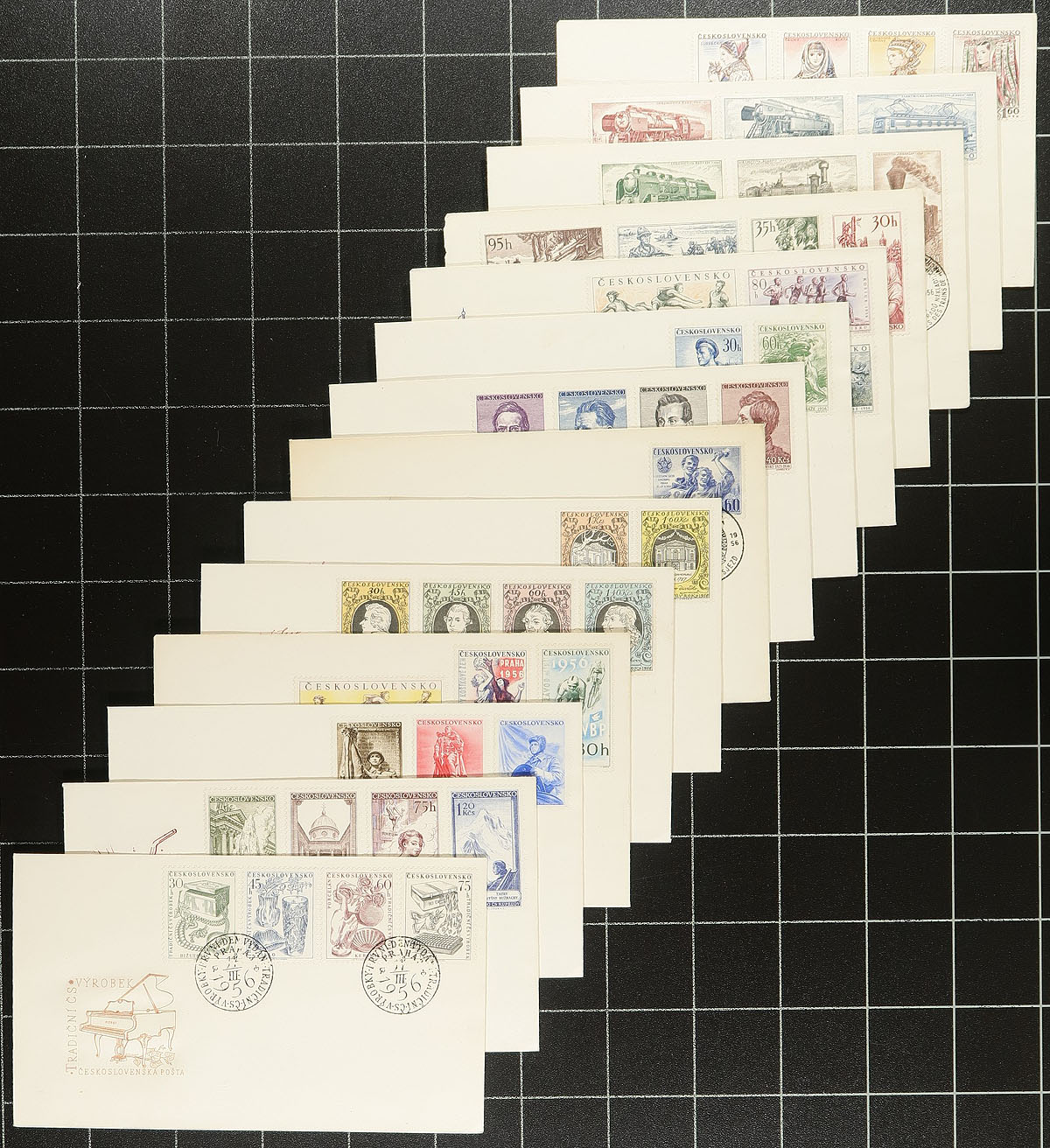 Group of roughly 275 Czechoslovakia first day covers, 1953-1970, neatly organized by year in a small box. We note mostly sets frankings, noting many thematic and topical frankings including butterflies, sports (including Olympics), transportation, animals, and more, including some nice cachets. A clean group for all collectors. Estimate =