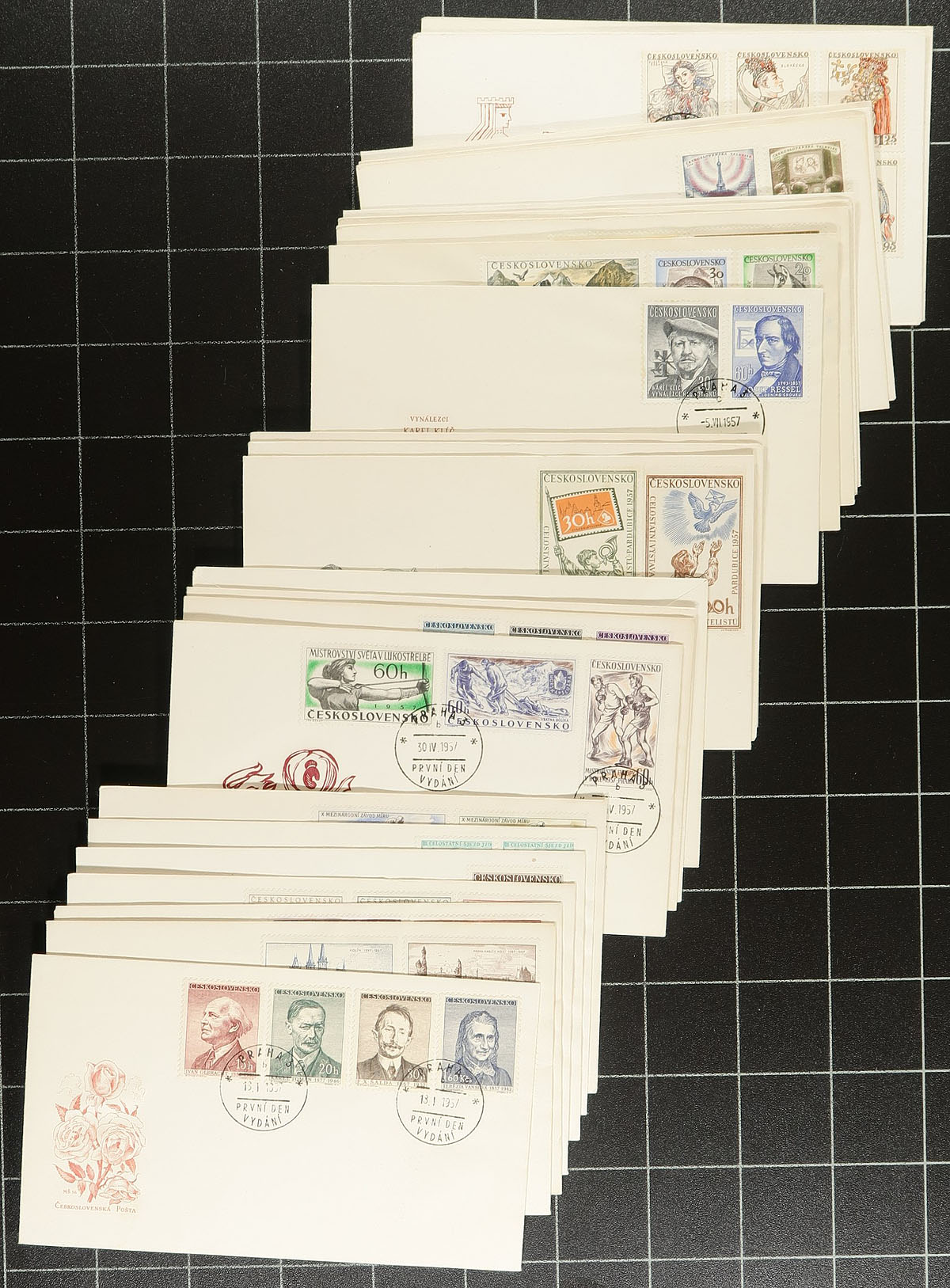 Group of roughly 275 Czechoslovakia first day covers, 1953-1970, neatly organized by year in a small box. We note mostly sets frankings, noting many thematic and topical frankings including butterflies, sports (including Olympics), transportation, animals, and more, including some nice cachets. A clean group for all collectors. Estimate =