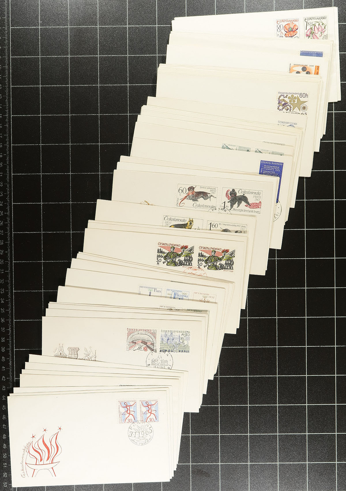 Group of roughly 275 Czechoslovakia first day covers, 1953-1970, neatly organized by year in a small box. We note mostly sets frankings, noting many thematic and topical frankings including butterflies, sports (including Olympics), transportation, animals, and more, including some nice cachets. A clean group for all collectors. Estimate =