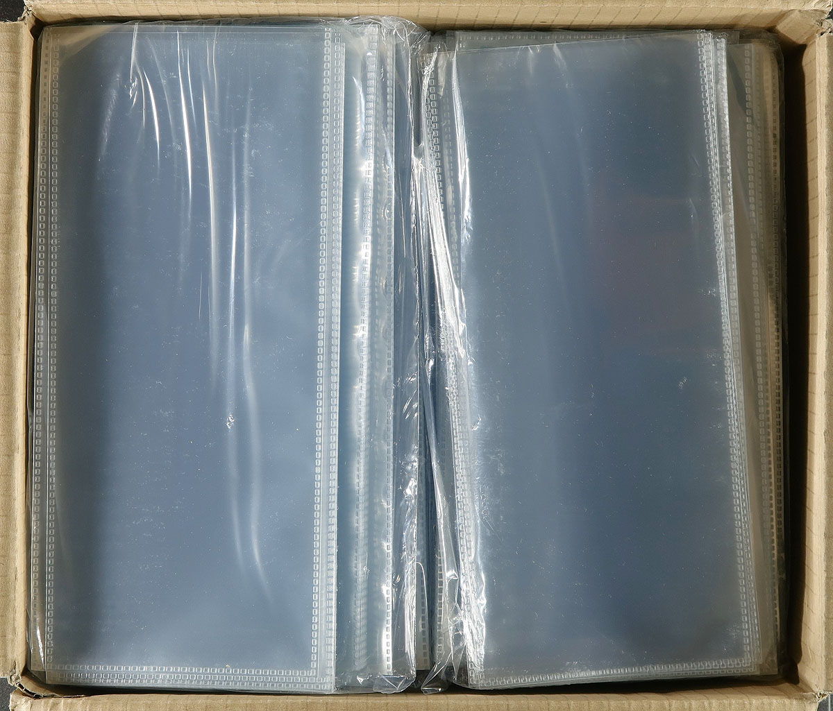 Plastic Cover Sleeves. A full box of 13x packs of 100 (1300 sleeves), each 117x262mm, meant to house #10 size covers (one of the more difficult sizes to find cover sleeves for). This "new old stock" box was unopened prior to us opening it to take a couple pictures. We note that these can easily be cut-down to make sleeves for covers smaller than #10 size. While these sleeves are no longer produced, the "as new" retail price would easily be over $200.00. Estimate =