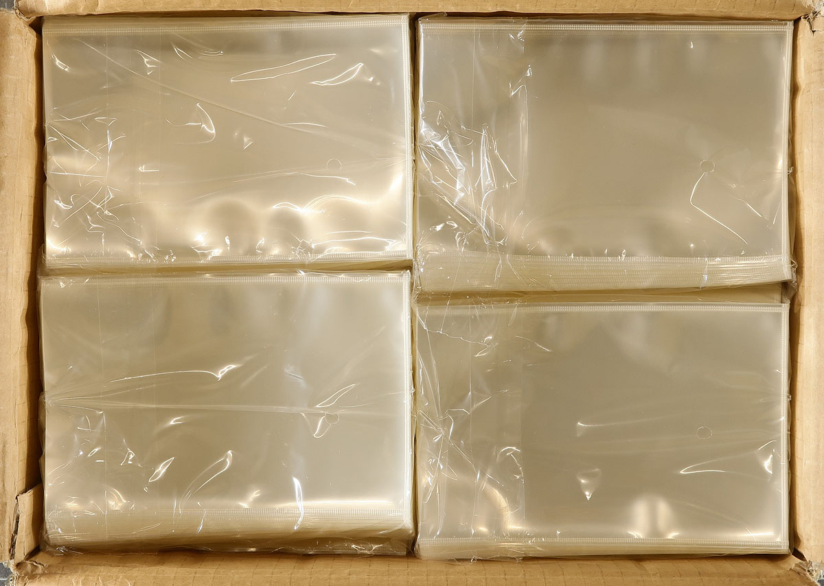 Plastic Postcard Sleeves. A full box 24x packs of 100 (2400 sleeves), each sized to house the traditional postcard (102x153mm). This "new old stock" box was unopened prior to us opening it to take a couple pictures. One of the most popular sleeve sizes. While these sleeves are no longer produced, the "as new" retail price would easily be over $200.00. Estimate =