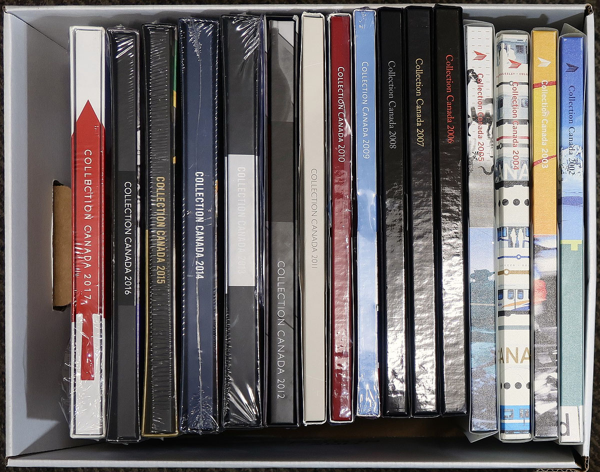 Annual Collections for 2002-2017 inclusive. Complete run of the 2002 to 2017 (inclusive) editions of Canada Post yearbooks, all with matching slipcases. These Canada Post publications contain the mint Never Hinged stamps, souvenir sheets and booklets for these 16 years. A high-quality group of these impressive and informative publications. Total face value of the mint NH stamps, panes and souvenir sheets in the 16 volumes is $926.31. 2025-2026 Unitrade =