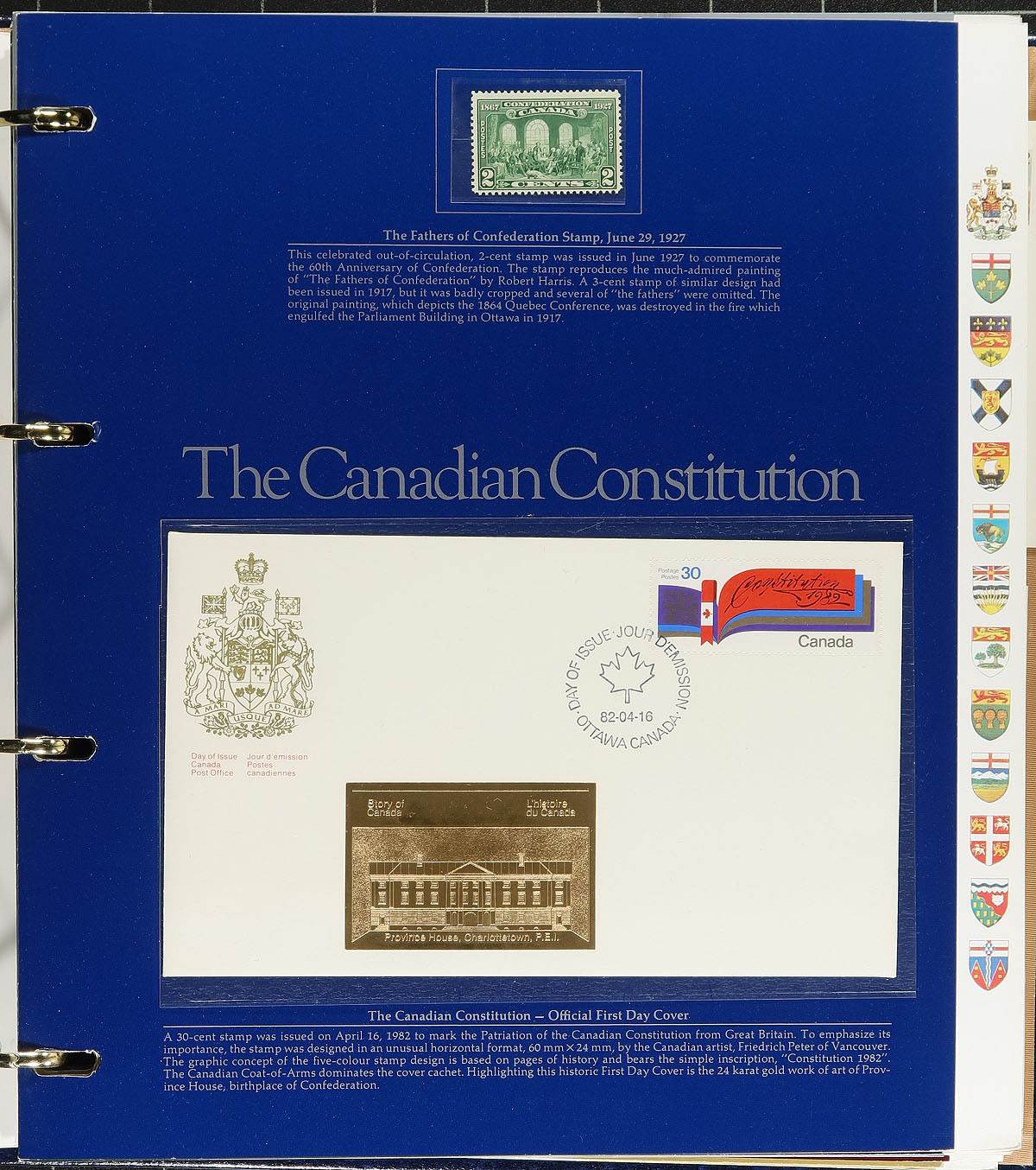 Eighty individually sold pages from the "Story of Canada" First Day Covers and mint stamp collection produced between 1982 and 1989. All housed in four deluxe slipcased albums with reams of additional information on all the issues that have been included in the series. All of the FDCs have additional embossed gold foil cachets unique to this series. Huge new issue cost and few of the sets we see are complete like this one. Estimate =