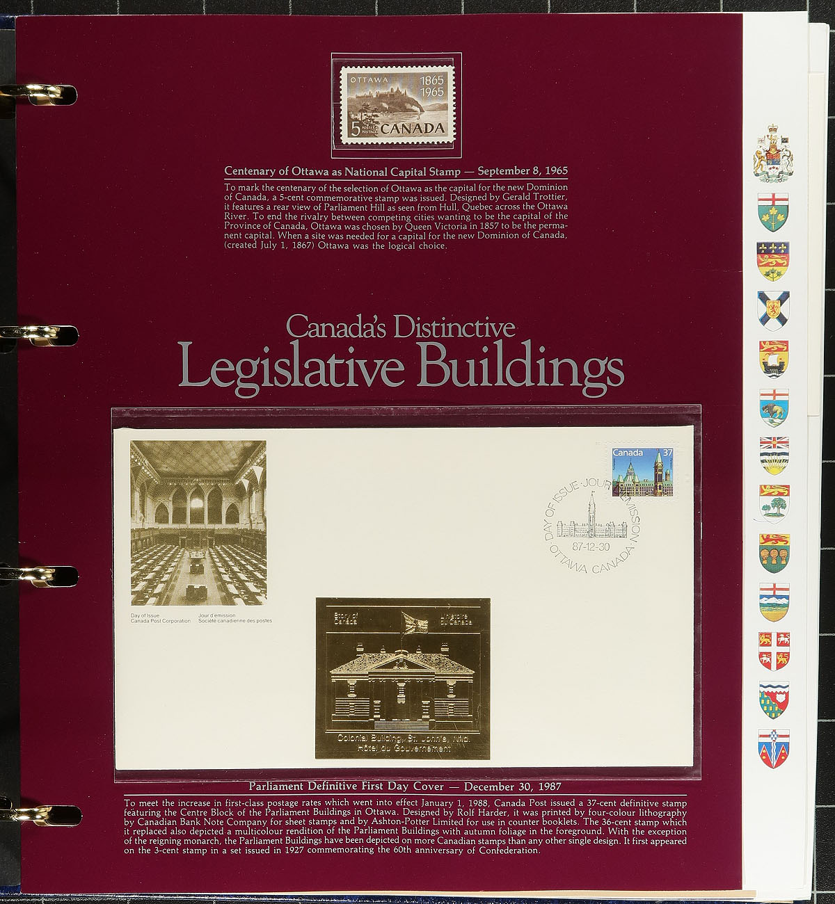 Eighty individually sold pages from the "Story of Canada" First Day Covers and mint stamp collection produced between 1982 and 1989. All housed in four deluxe slipcased albums with reams of additional information on all the issues that have been included in the series. All of the FDCs have additional embossed gold foil cachets unique to this series. Huge new issue cost and few of the sets we see are complete like this one. Estimate =