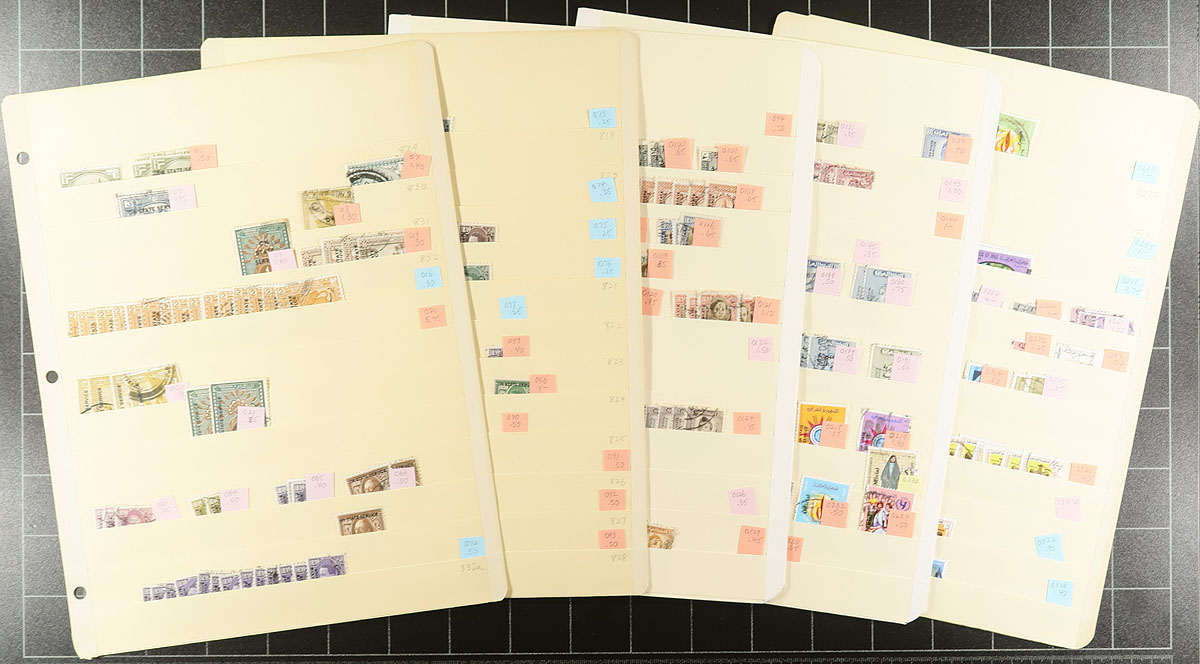 Middle East Duo of Binders. A well organized collector's stock on manila stockpages, within two binders. Binder #1 includes Iran "back of the book", Iraq (regular issues and airmails), a smattering of Abu Dhabi, Ajman, Dubai and Fujairah. Binder #2 includes Iraq Officials/Postal Tax issues, Oman, Qatar and a smattering of Sharjah, South Arabia and Ull Al Qiwain. Several hundred stamps in total, plus about 60 decent condition manila stockpages! Estimate =