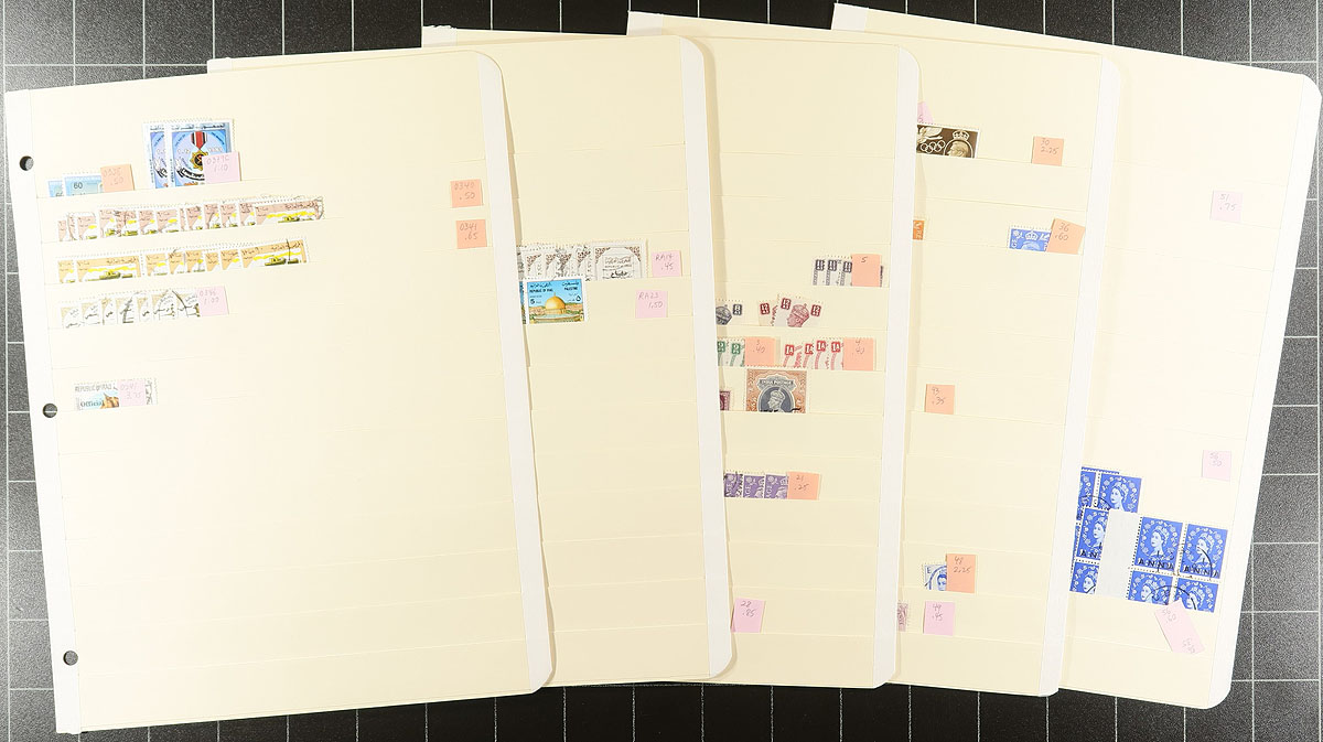 Middle East Duo of Binders. A well organized collector's stock on manila stockpages, within two binders. Binder #1 includes Iran "back of the book", Iraq (regular issues and airmails), a smattering of Abu Dhabi, Ajman, Dubai and Fujairah. Binder #2 includes Iraq Officials/Postal Tax issues, Oman, Qatar and a smattering of Sharjah, South Arabia and Ull Al Qiwain. Several hundred stamps in total, plus about 60 decent condition manila stockpages! Estimate =
