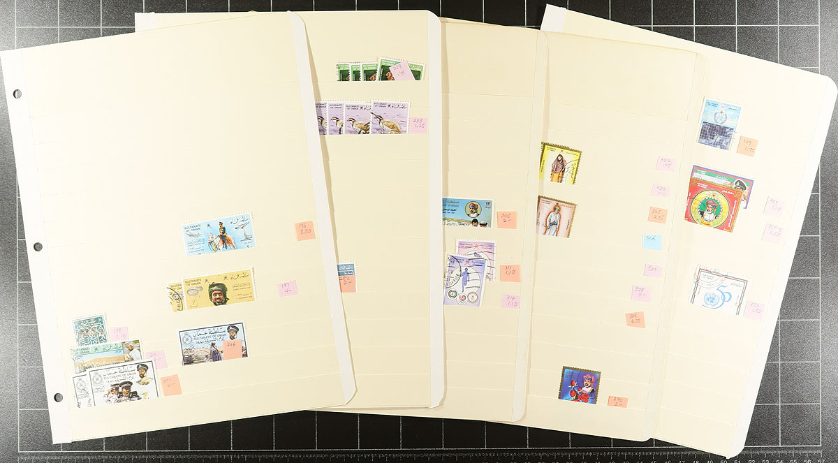 Middle East Duo of Binders. A well organized collector's stock on manila stockpages, within two binders. Binder #1 includes Iran "back of the book", Iraq (regular issues and airmails), a smattering of Abu Dhabi, Ajman, Dubai and Fujairah. Binder #2 includes Iraq Officials/Postal Tax issues, Oman, Qatar and a smattering of Sharjah, South Arabia and Ull Al Qiwain. Several hundred stamps in total, plus about 60 decent condition manila stockpages! Estimate =
