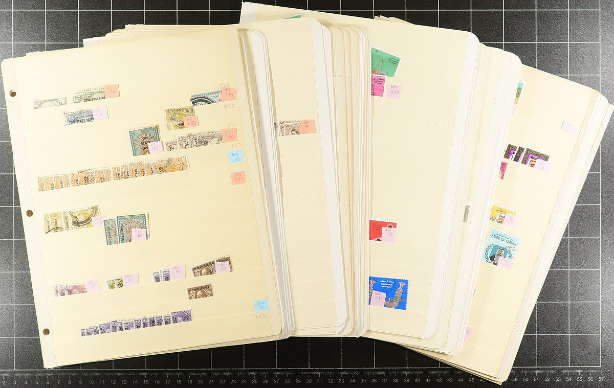 Middle East Duo of Binders. A well organized collector's stock on manila stockpages, within two binders. Binder #1 includes Iran "back of the book", Iraq (regular issues and airmails), a smattering of Abu Dhabi, Ajman, Dubai and Fujairah. Binder #2 includes Iraq Officials/Postal Tax issues, Oman, Qatar and a smattering of Sharjah, South Arabia and Ull Al Qiwain. Several hundred stamps in total, plus about 60 decent condition manila stockpages! Estimate =