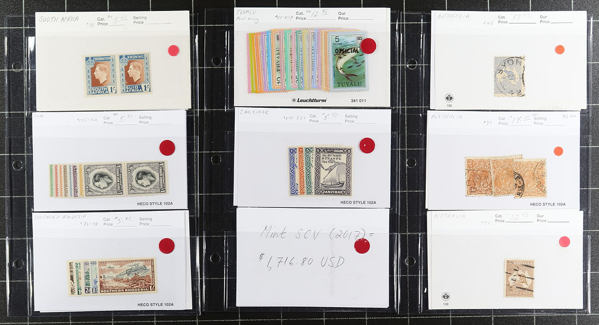A dealer's show book, holding "102" cards, from Victorian to 1970's (with minor duplication). Organized alphabetical, with good representation from across the Empire. The owner's catalogue value (Scott, unknown year) for the mint is US$1716.00 and used US$930.00. Total owner's Scott US$2,646.00 =