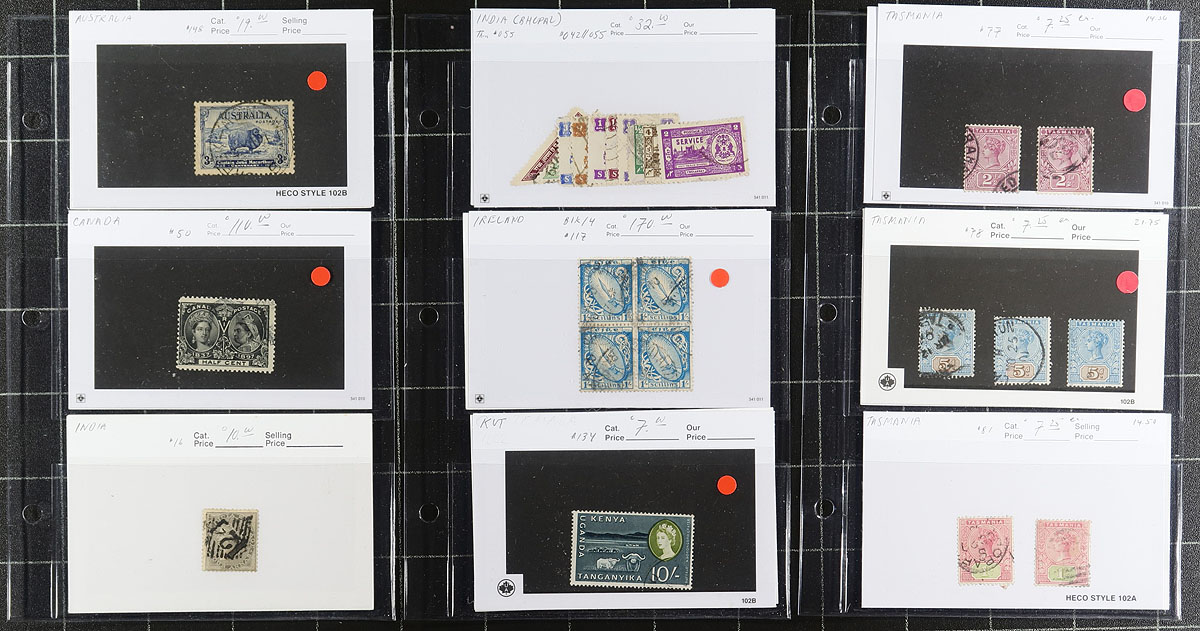 A dealer's show book, holding "102" cards, from Victorian to 1970's (with minor duplication). Organized alphabetical, with good representation from across the Empire. The owner's catalogue value (Scott, unknown year) for the mint is US$1716.00 and used US$930.00. Total owner's Scott US$2,646.00 =
