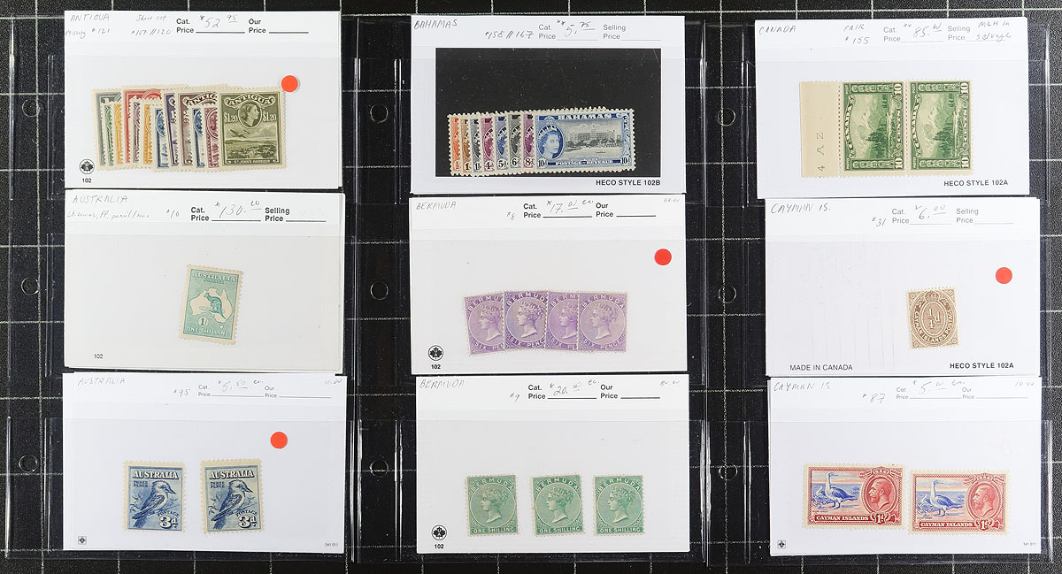 A dealer's show book, holding "102" cards, from Victorian to 1970's (with minor duplication). Organized alphabetical, with good representation from across the Empire. The owner's catalogue value (Scott, unknown year) for the mint is US$1716.00 and used US$930.00. Total owner's Scott US$2,646.00 =