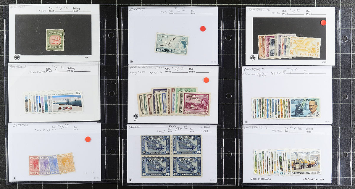 A dealer's show book, holding "102" cards, from Victorian to 1970's (with minor duplication). Organized alphabetical, with good representation from across the Empire. The owner's catalogue value (Scott, unknown year) for the mint is US$1716.00 and used US$930.00. Total owner's Scott US$2,646.00 =