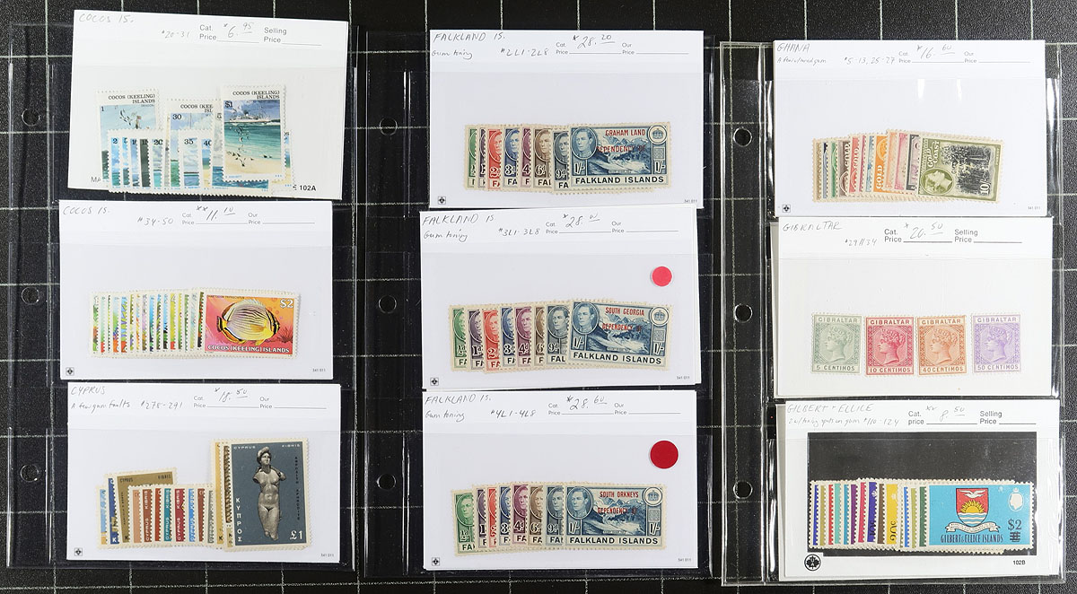 A dealer's show book, holding "102" cards, from Victorian to 1970's (with minor duplication). Organized alphabetical, with good representation from across the Empire. The owner's catalogue value (Scott, unknown year) for the mint is US$1716.00 and used US$930.00. Total owner's Scott US$2,646.00 =