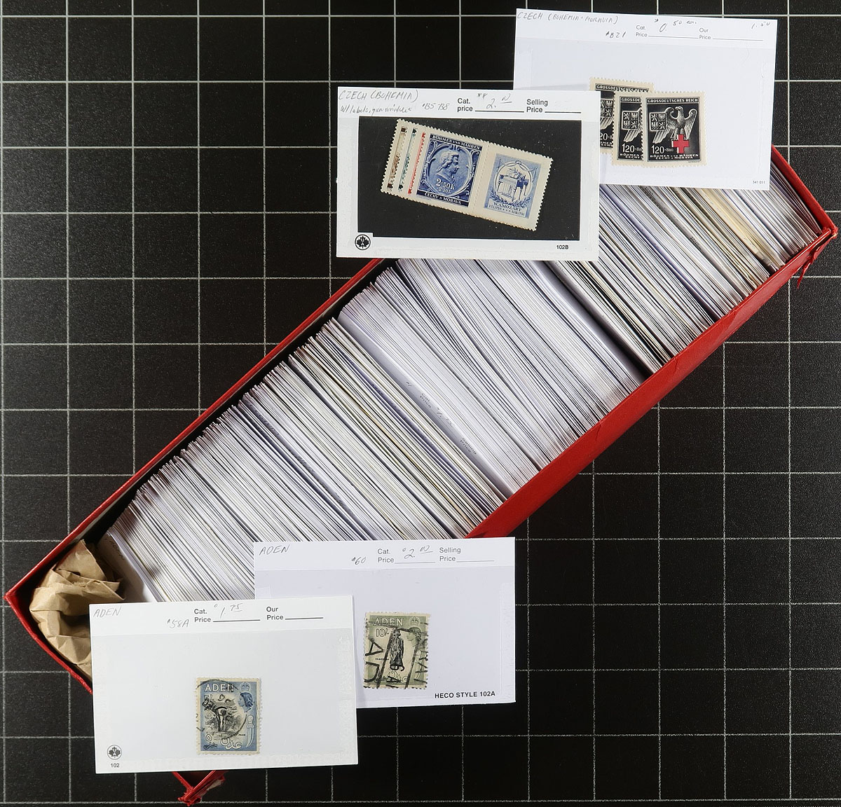 Red Box Bonanza. A group of four dealer "red boxes" stuffed with "102" cards from around the globe. The owner nots that each box contains about 800x "102" cards (3200 "102" cards in total), with a conservative average "102" card catalogue value of $1.50, making for an estimate US$4800.00 of catalogue value! Add on to that, that the bulk of the work in identification is already one. Estimate =