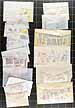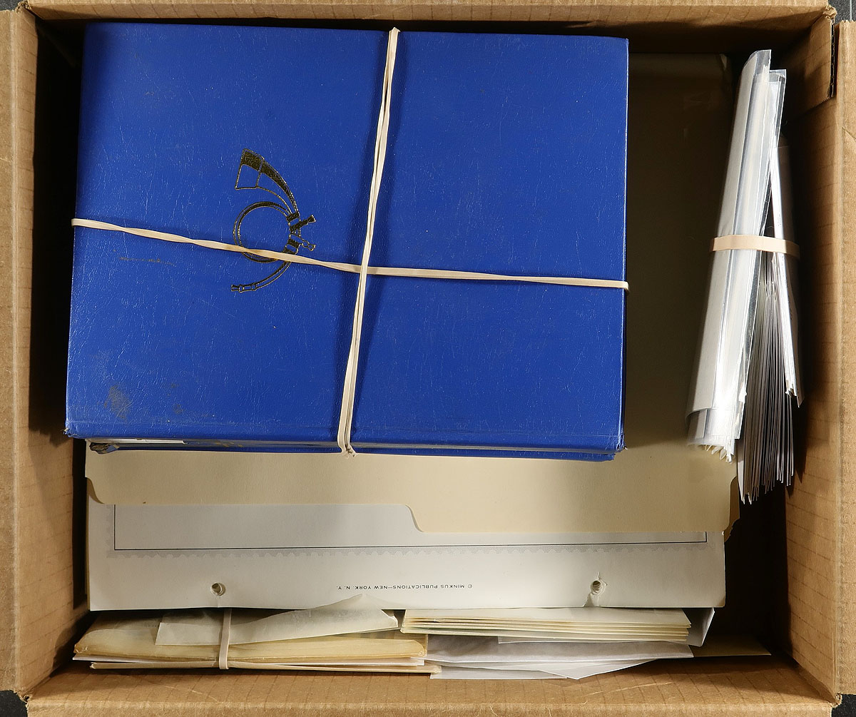 British Commonwealth Boxed Delight. A medium size both, containing 5 small blue stockbooks containing 1937 Coronation mint stock, with singles and blocks. There is also other Omnubus issues noted, including Freedom from Hunger, International Co-Op Year, International Telecom Union x2, UNESCO, Red Cross and WHO Headquarters. These books are complimented by a group of New Zealand on pages, India Revenues, "odds and ends" (as described by the consignor), "102" cards, glassines, manila pages etc. A fun sort ahead here. Estimate =