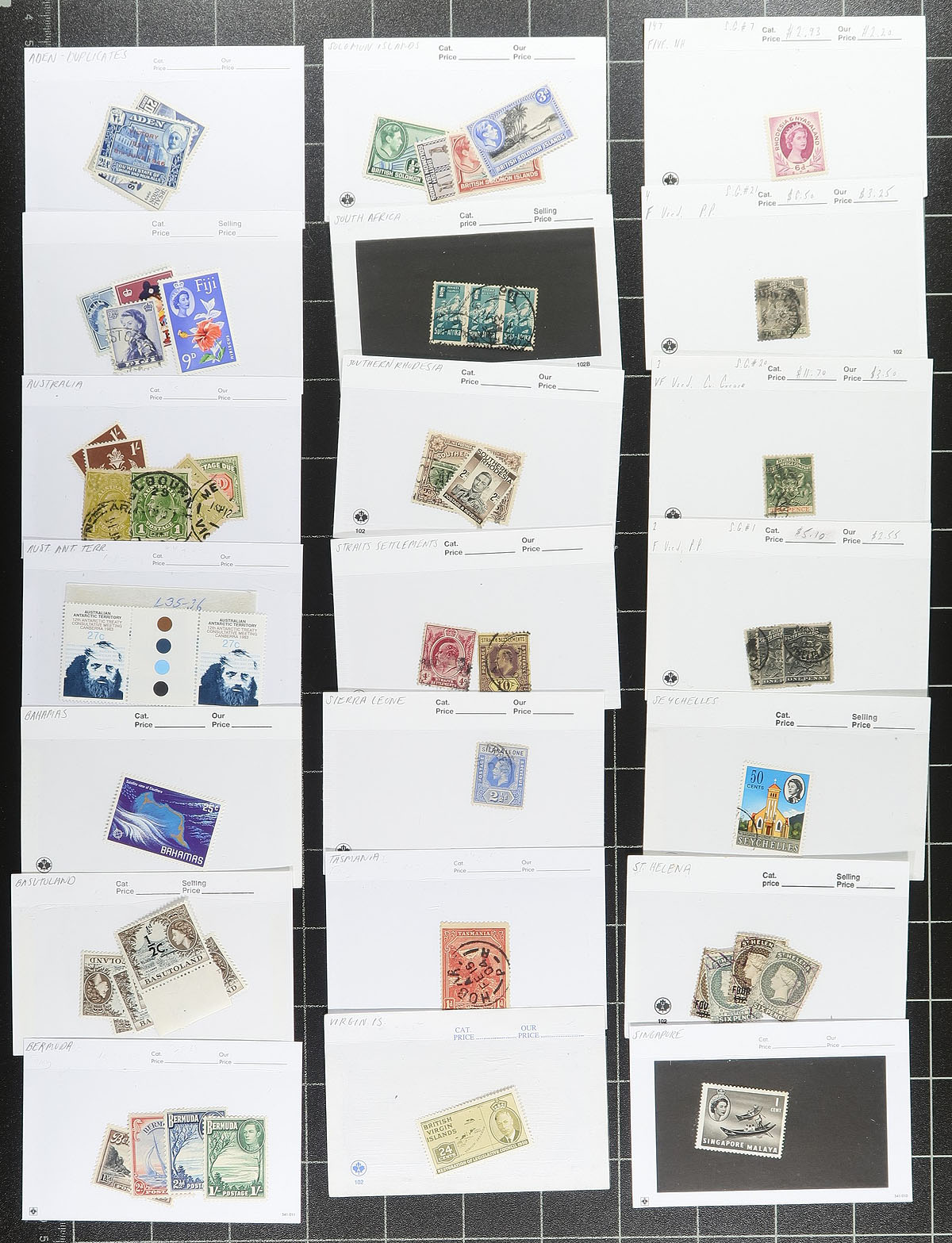 British Commonwealth Boxed Delight. A medium size both, containing 5 small blue stockbooks containing 1937 Coronation mint stock, with singles and blocks. There is also other Omnubus issues noted, including Freedom from Hunger, International Co-Op Year, International Telecom Union x2, UNESCO, Red Cross and WHO Headquarters. These books are complimented by a group of New Zealand on pages, India Revenues, "odds and ends" (as described by the consignor), "102" cards, glassines, manila pages etc. A fun sort ahead here. Estimate =