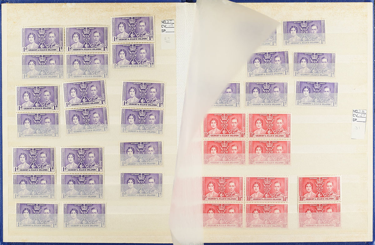 British Commonwealth Boxed Delight. A medium size both, containing 5 small blue stockbooks containing 1937 Coronation mint stock, with singles and blocks. There is also other Omnubus issues noted, including Freedom from Hunger, International Co-Op Year, International Telecom Union x2, UNESCO, Red Cross and WHO Headquarters. These books are complimented by a group of New Zealand on pages, India Revenues, "odds and ends" (as described by the consignor), "102" cards, glassines, manila pages etc. A fun sort ahead here. Estimate =