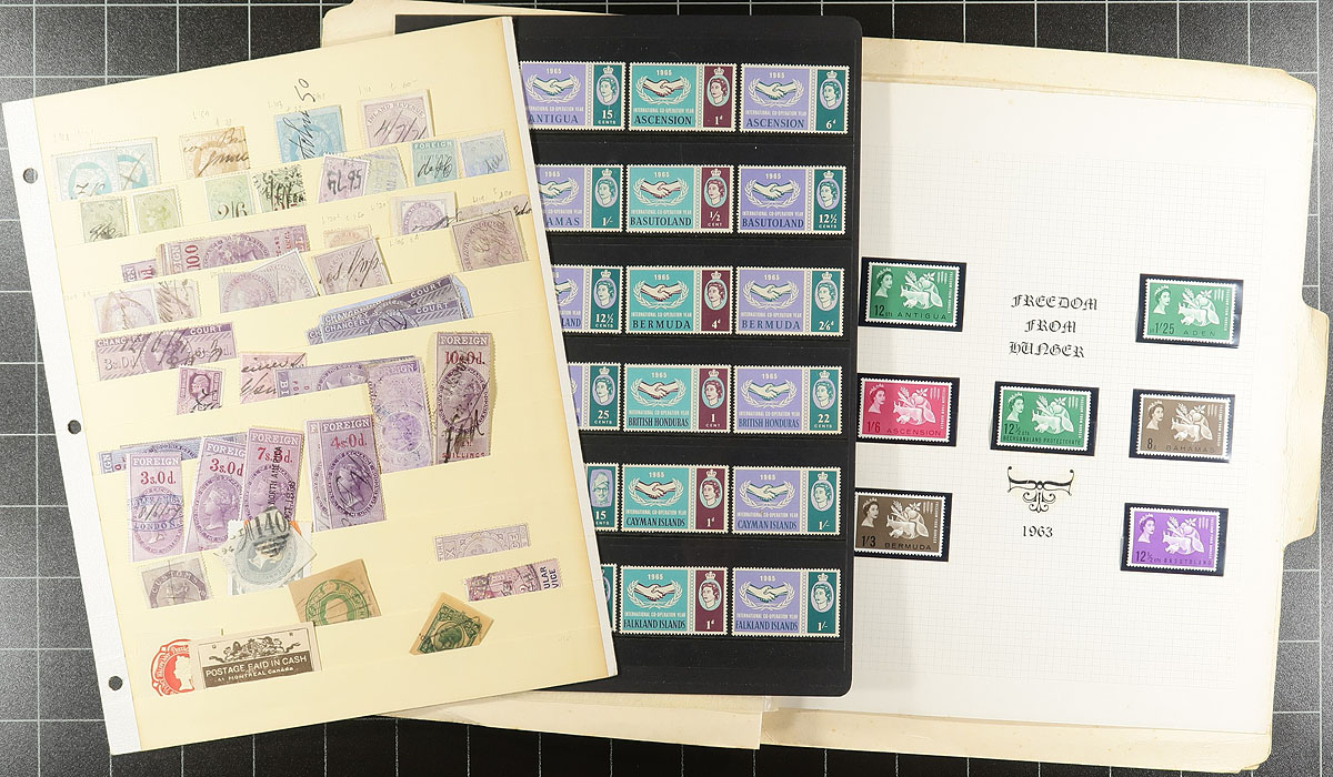 British Commonwealth Boxed Delight. A medium size both, containing 5 small blue stockbooks containing 1937 Coronation mint stock, with singles and blocks. There is also other Omnubus issues noted, including Freedom from Hunger, International Co-Op Year, International Telecom Union x2, UNESCO, Red Cross and WHO Headquarters. These books are complimented by a group of New Zealand on pages, India Revenues, "odds and ends" (as described by the consignor), "102" cards, glassines, manila pages etc. A fun sort ahead here. Estimate =