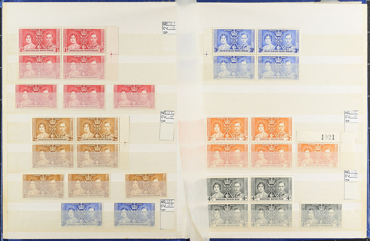 British Commonwealth Boxed Delight. A medium size both, containing 5 small blue stockbooks containing 1937 Coronation mint stock, with singles and blocks. There is also other Omnubus issues noted, including Freedom from Hunger, International Co-Op Year, International Telecom Union x2, UNESCO, Red Cross and WHO Headquarters. These books are complimented by a group of New Zealand on pages, India Revenues, "odds and ends" (as described by the consignor), "102" cards, glassines, manila pages etc. A fun sort ahead here. Estimate =