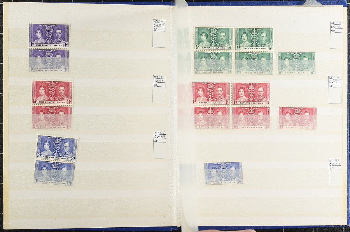 British Commonwealth Boxed Delight. A medium size both, containing 5 small blue stockbooks containing 1937 Coronation mint stock, with singles and blocks. There is also other Omnubus issues noted, including Freedom from Hunger, International Co-Op Year, International Telecom Union x2, UNESCO, Red Cross and WHO Headquarters. These books are complimented by a group of New Zealand on pages, India Revenues, "odds and ends" (as described by the consignor), "102" cards, glassines, manila pages etc. A fun sort ahead here. Estimate =