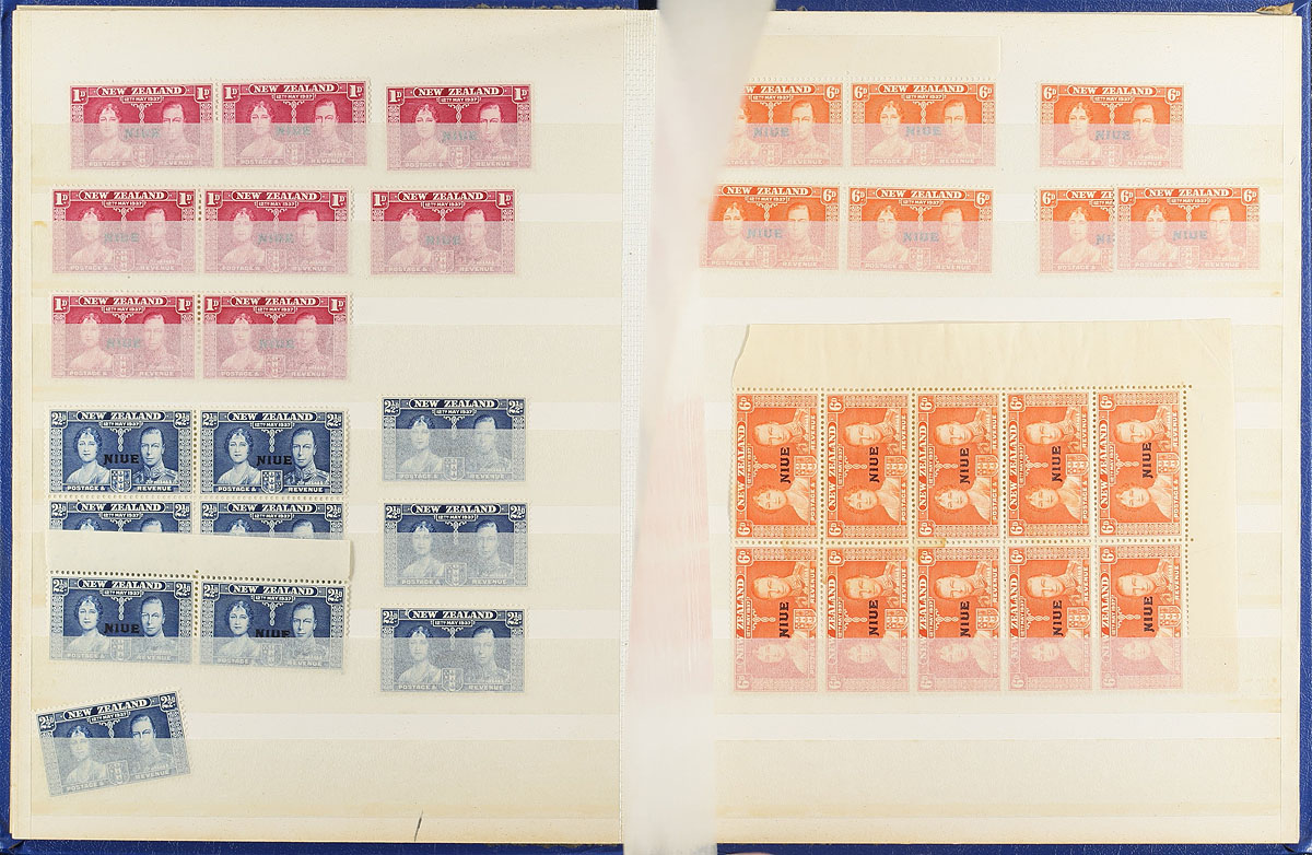British Commonwealth Boxed Delight. A medium size both, containing 5 small blue stockbooks containing 1937 Coronation mint stock, with singles and blocks. There is also other Omnubus issues noted, including Freedom from Hunger, International Co-Op Year, International Telecom Union x2, UNESCO, Red Cross and WHO Headquarters. These books are complimented by a group of New Zealand on pages, India Revenues, "odds and ends" (as described by the consignor), "102" cards, glassines, manila pages etc. A fun sort ahead here. Estimate =