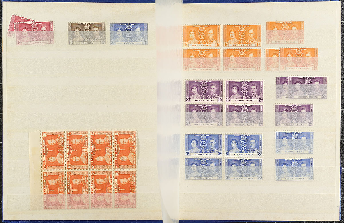 British Commonwealth Boxed Delight. A medium size both, containing 5 small blue stockbooks containing 1937 Coronation mint stock, with singles and blocks. There is also other Omnubus issues noted, including Freedom from Hunger, International Co-Op Year, International Telecom Union x2, UNESCO, Red Cross and WHO Headquarters. These books are complimented by a group of New Zealand on pages, India Revenues, "odds and ends" (as described by the consignor), "102" cards, glassines, manila pages etc. A fun sort ahead here. Estimate =