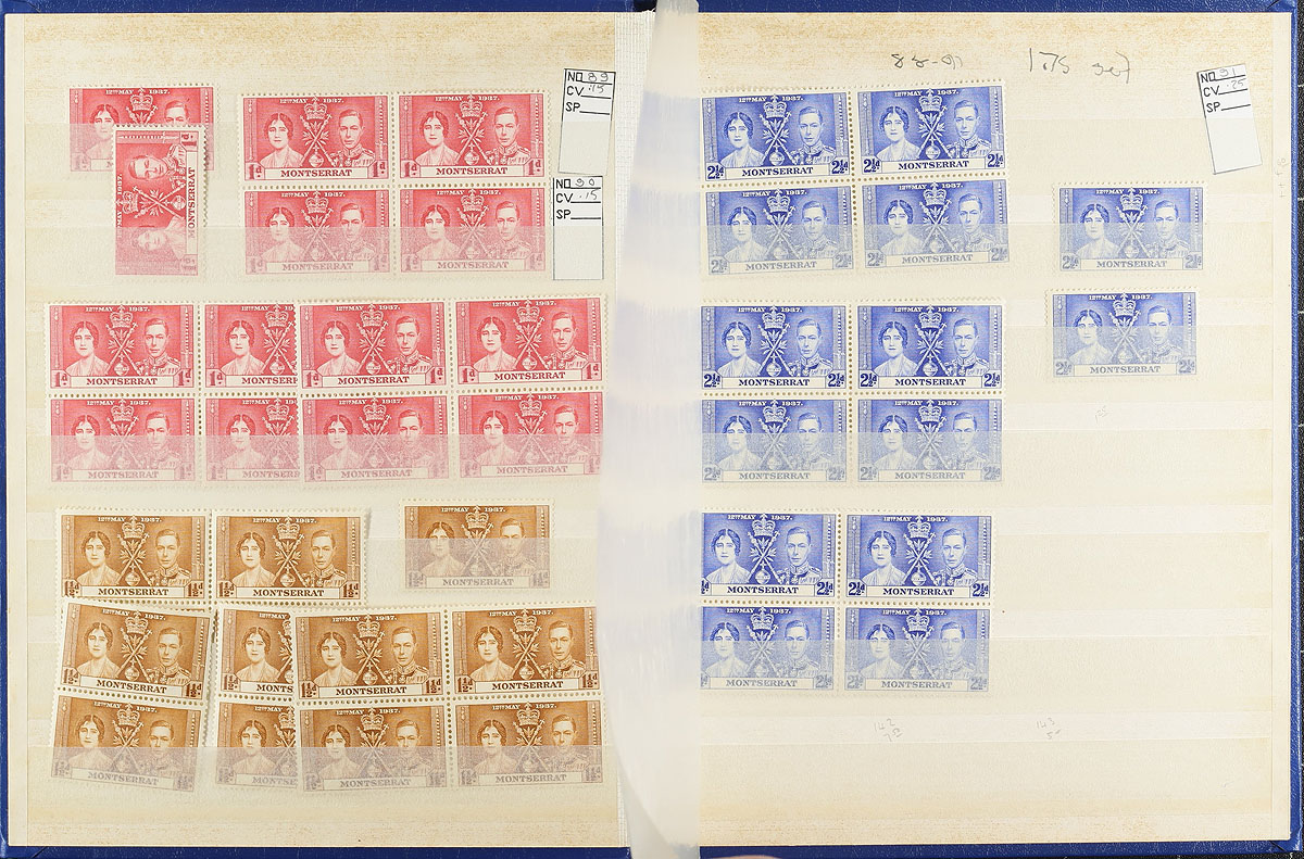 British Commonwealth Boxed Delight. A medium size both, containing 5 small blue stockbooks containing 1937 Coronation mint stock, with singles and blocks. There is also other Omnubus issues noted, including Freedom from Hunger, International Co-Op Year, International Telecom Union x2, UNESCO, Red Cross and WHO Headquarters. These books are complimented by a group of New Zealand on pages, India Revenues, "odds and ends" (as described by the consignor), "102" cards, glassines, manila pages etc. A fun sort ahead here. Estimate =