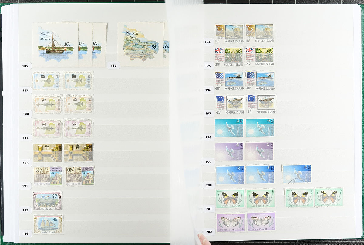 A mint (mostly) and used collector's assembly of Norfolk Islands, including #1-12 in blocks of four (these are MNH, but expect a mix of Hinged / Never Hinged throughout), all neatly identified as to Scott catalogue number and held in a like-new Lighthouse 64-page stockbook (white pages). Includes the owner's inventory list, outlining all items included. Consider the stockbook now retails for over $60.00 alone. Owner's 2021 Scott US$725.05 =