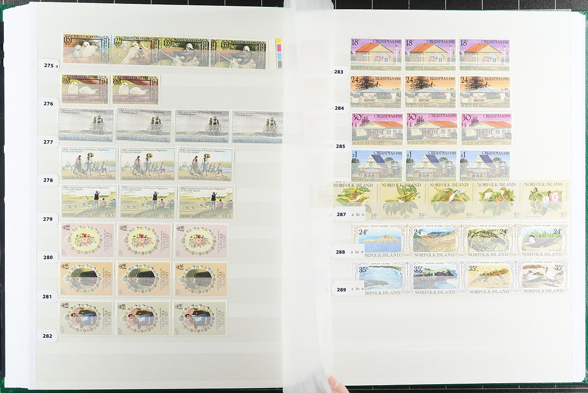 A mint (mostly) and used collector's assembly of Norfolk Islands, including #1-12 in blocks of four (these are MNH, but expect a mix of Hinged / Never Hinged throughout), all neatly identified as to Scott catalogue number and held in a like-new Lighthouse 64-page stockbook (white pages). Includes the owner's inventory list, outlining all items included. Consider the stockbook now retails for over $60.00 alone. Owner's 2021 Scott US$725.05 =