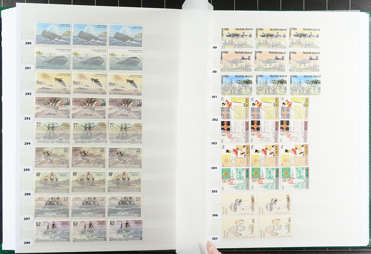 A mint (mostly) and used collector's assembly of Norfolk Islands, including #1-12 in blocks of four (these are MNH, but expect a mix of Hinged / Never Hinged throughout), all neatly identified as to Scott catalogue number and held in a like-new Lighthouse 64-page stockbook (white pages). Includes the owner's inventory list, outlining all items included. Consider the stockbook now retails for over $60.00 alone. Owner's 2021 Scott US$725.05 =