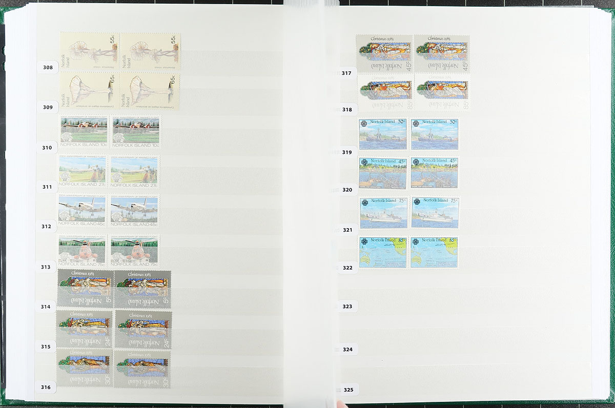 A mint (mostly) and used collector's assembly of Norfolk Islands, including #1-12 in blocks of four (these are MNH, but expect a mix of Hinged / Never Hinged throughout), all neatly identified as to Scott catalogue number and held in a like-new Lighthouse 64-page stockbook (white pages). Includes the owner's inventory list, outlining all items included. Consider the stockbook now retails for over $60.00 alone. Owner's 2021 Scott US$725.05 =