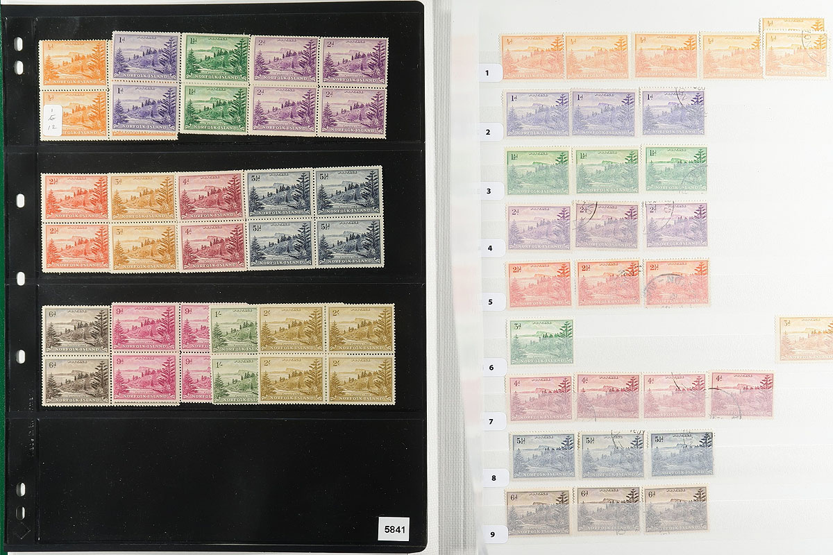 A mint (mostly) and used collector's assembly of Norfolk Islands, including #1-12 in blocks of four (these are MNH, but expect a mix of Hinged / Never Hinged throughout), all neatly identified as to Scott catalogue number and held in a like-new Lighthouse 64-page stockbook (white pages). Includes the owner's inventory list, outlining all items included. Consider the stockbook now retails for over $60.00 alone. Owner's 2021 Scott US$725.05 =