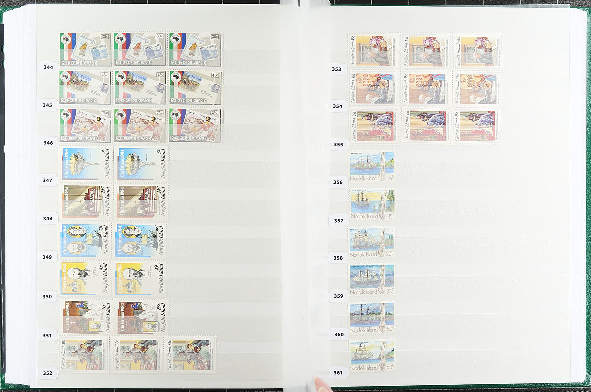 A mint (mostly) and used collector's assembly of Norfolk Islands, including #1-12 in blocks of four (these are MNH, but expect a mix of Hinged / Never Hinged throughout), all neatly identified as to Scott catalogue number and held in a like-new Lighthouse 64-page stockbook (white pages). Includes the owner's inventory list, outlining all items included. Consider the stockbook now retails for over $60.00 alone. Owner's 2021 Scott US$725.05 =