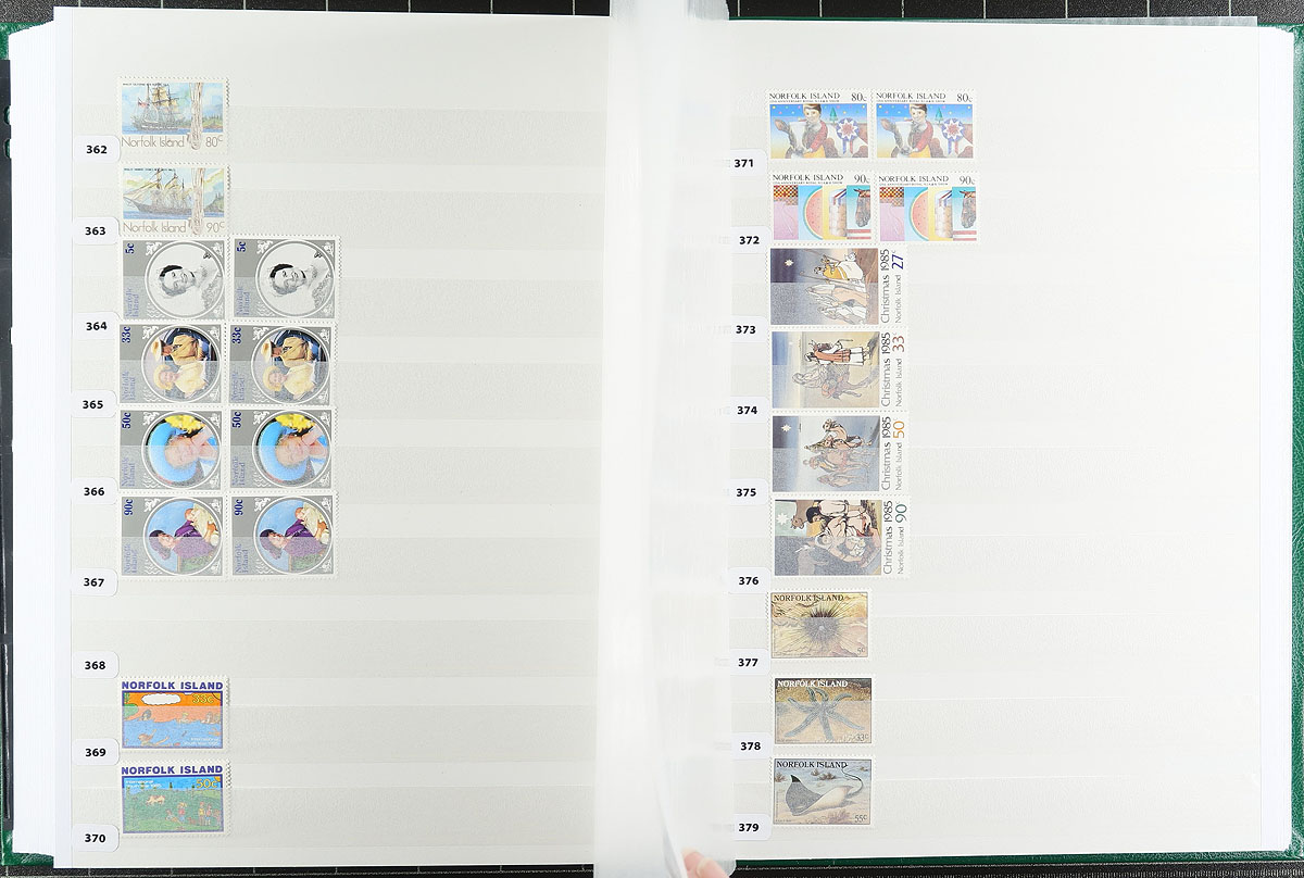 A mint (mostly) and used collector's assembly of Norfolk Islands, including #1-12 in blocks of four (these are MNH, but expect a mix of Hinged / Never Hinged throughout), all neatly identified as to Scott catalogue number and held in a like-new Lighthouse 64-page stockbook (white pages). Includes the owner's inventory list, outlining all items included. Consider the stockbook now retails for over $60.00 alone. Owner's 2021 Scott US$725.05 =