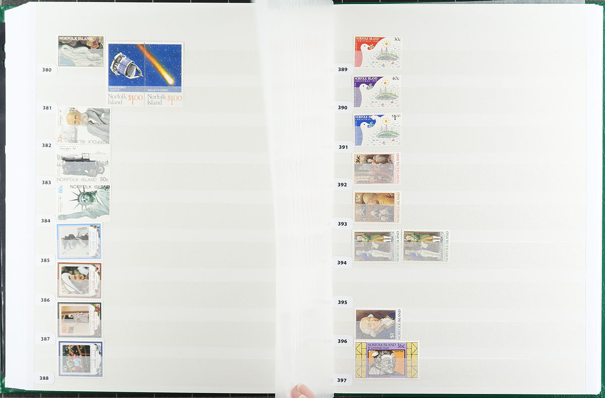 A mint (mostly) and used collector's assembly of Norfolk Islands, including #1-12 in blocks of four (these are MNH, but expect a mix of Hinged / Never Hinged throughout), all neatly identified as to Scott catalogue number and held in a like-new Lighthouse 64-page stockbook (white pages). Includes the owner's inventory list, outlining all items included. Consider the stockbook now retails for over $60.00 alone. Owner's 2021 Scott US$725.05 =