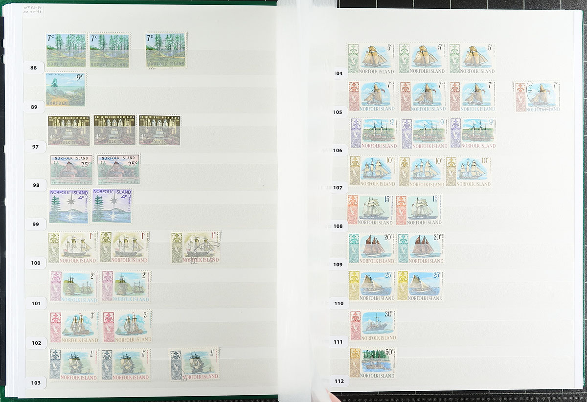 A mint (mostly) and used collector's assembly of Norfolk Islands, including #1-12 in blocks of four (these are MNH, but expect a mix of Hinged / Never Hinged throughout), all neatly identified as to Scott catalogue number and held in a like-new Lighthouse 64-page stockbook (white pages). Includes the owner's inventory list, outlining all items included. Consider the stockbook now retails for over $60.00 alone. Owner's 2021 Scott US$725.05 =