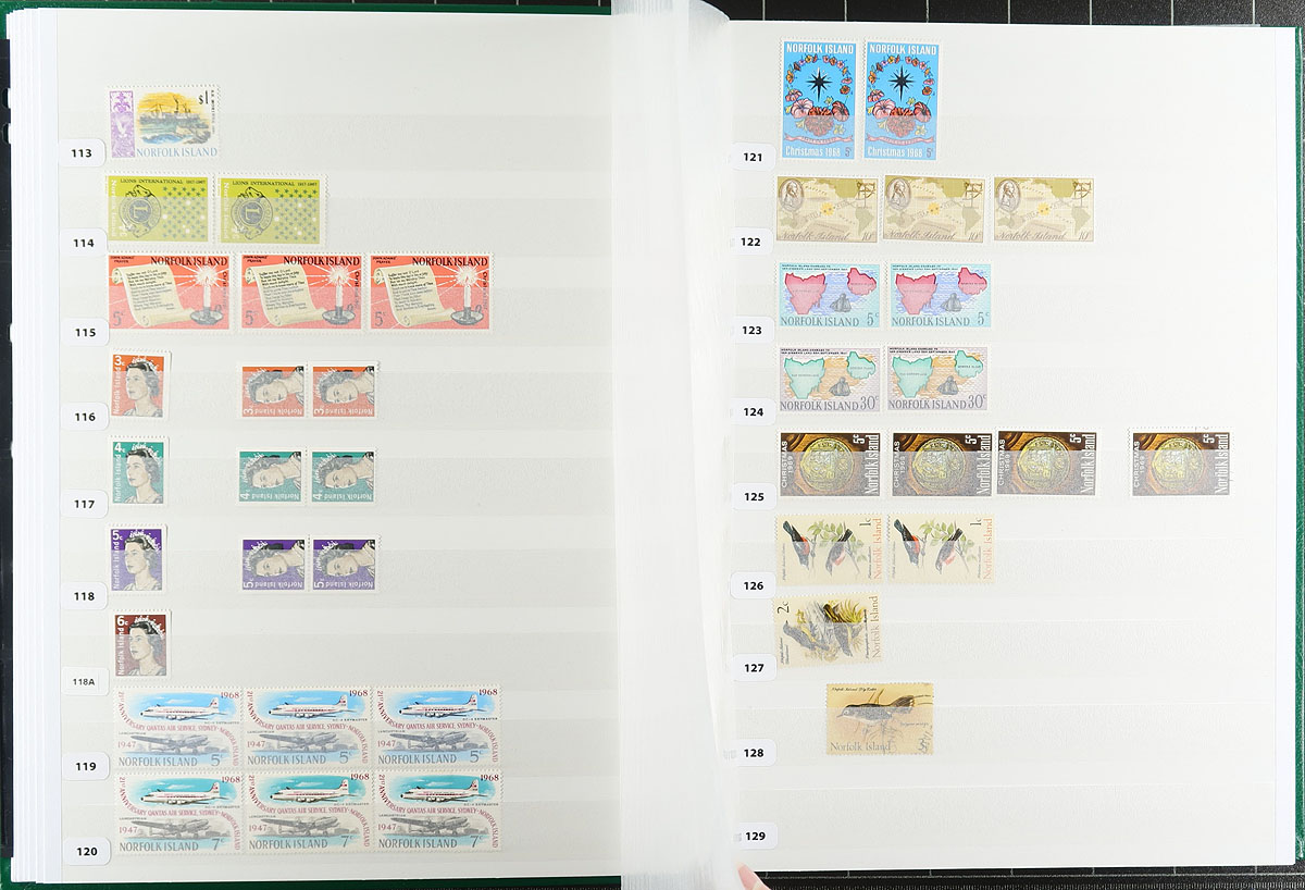 A mint (mostly) and used collector's assembly of Norfolk Islands, including #1-12 in blocks of four (these are MNH, but expect a mix of Hinged / Never Hinged throughout), all neatly identified as to Scott catalogue number and held in a like-new Lighthouse 64-page stockbook (white pages). Includes the owner's inventory list, outlining all items included. Consider the stockbook now retails for over $60.00 alone. Owner's 2021 Scott US$725.05 =