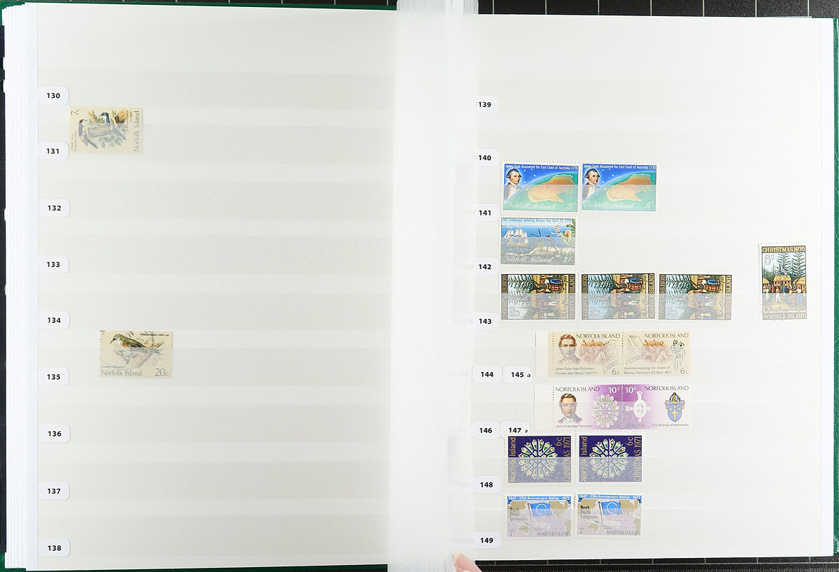 A mint (mostly) and used collector's assembly of Norfolk Islands, including #1-12 in blocks of four (these are MNH, but expect a mix of Hinged / Never Hinged throughout), all neatly identified as to Scott catalogue number and held in a like-new Lighthouse 64-page stockbook (white pages). Includes the owner's inventory list, outlining all items included. Consider the stockbook now retails for over $60.00 alone. Owner's 2021 Scott US$725.05 =