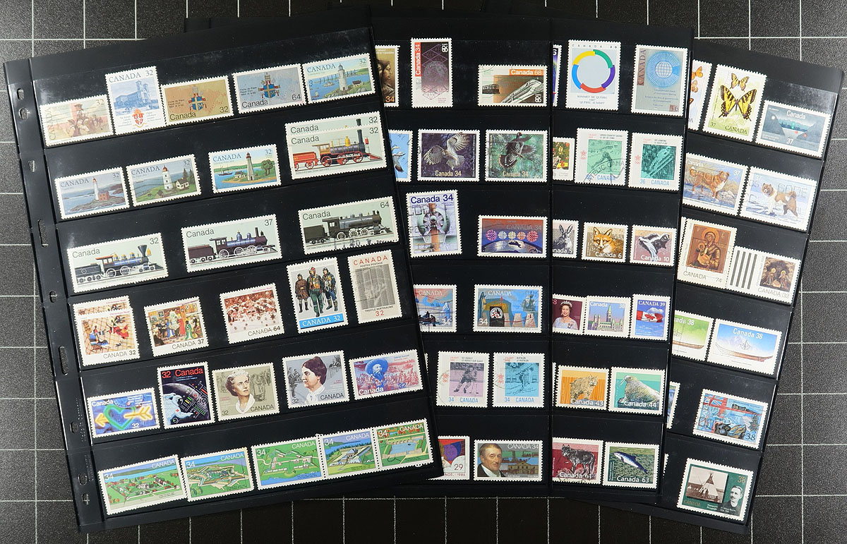 Large used collection of Canada 1859-2020, containing a few thousand stamps, neatly organized in roughly 55 double-sided Vario stock pages, housed in a thick binder. This collection has a little bit of everything including a few Small Queens, Jubilees, Leafs, Numerals, and continues with sets and partial sets of Edwards (full set), Quebecs (up to 7c), Admirals, Scrolls (up to 50c Bluenose), and complete sets of Arch, Pictorials, War and Peace issues. The collection continues with a good run of issues, including many modern used (8 double sided pages of post-2010 issues), along with a small selection of officials (perforated and overprinted), special delivery, revenues, and Newfoundland. A nice lot with duplication up to 10 for only a few issues. Online photos show a small sampling. Estimate =