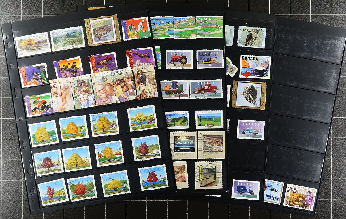 Large used collection of Canada 1859-2020, containing a few thousand stamps, neatly organized in roughly 55 double-sided Vario stock pages, housed in a thick binder. This collection has a little bit of everything including a few Small Queens, Jubilees, Leafs, Numerals, and continues with sets and partial sets of Edwards (full set), Quebecs (up to 7c), Admirals, Scrolls (up to 50c Bluenose), and complete sets of Arch, Pictorials, War and Peace issues. The collection continues with a good run of issues, including many modern used (8 double sided pages of post-2010 issues), along with a small selection of officials (perforated and overprinted), special delivery, revenues, and Newfoundland. A nice lot with duplication up to 10 for only a few issues. Online photos show a small sampling. Estimate =