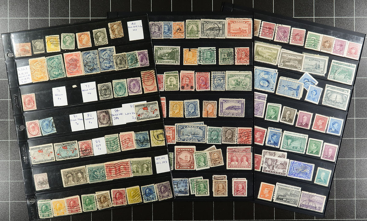 Large used collection of Canada 1859-2020, containing a few thousand stamps, neatly organized in roughly 55 double-sided Vario stock pages, housed in a thick binder. This collection has a little bit of everything including a few Small Queens, Jubilees, Leafs, Numerals, and continues with sets and partial sets of Edwards (full set), Quebecs (up to 7c), Admirals, Scrolls (up to 50c Bluenose), and complete sets of Arch, Pictorials, War and Peace issues. The collection continues with a good run of issues, including many modern used (8 double sided pages of post-2010 issues), along with a small selection of officials (perforated and overprinted), special delivery, revenues, and Newfoundland. A nice lot with duplication up to 10 for only a few issues. Online photos show a small sampling. Estimate =